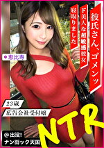 街中で仲の良さそうなカップルに声をかけて夜の営みについて聞いちゃう企画!ってのは建前で、 彼女を寝取ってパコってSEXしてしまうという企画第1弾! 今回のターゲットはめぐみさん(23歳) 年上の彼氏とデートしていためぐみさん。 インタビューの内容に驚き恥ずかしがっているめぐみさんとは裏腹にちょっぴり乗り気な彼氏さん。 どちらが告白したのかや、月のSEXの回数など2人の馴れ初めや性事情を赤裸々に暴露してもらっちゃいましたw (詳しくは本編でお楽しみくださいw) 2人とも同じ空間で質問されているのは恥ずかしいと思い、スタッフの配慮で別々の部屋で更に話を聞いちゃいますw 彼氏が目の前にいた手前先ほどは、セックスに満足しているとの質問に対し、している寄りのあやふやな回答をしていたが、 実際のところ満足しておらず、常に欲求不満ぎみとのことwww 男女付き合いを円満にするためには刺激が必要なので!しちゃいます!エッチなことをw 隣の部屋に彼氏がいるからと言いながらもおっぱいを触られると声を抑えて感じてしまうめぐみさん。 だんだんエスカレートしていき手マン!激しい潮吹きでソファがぐっしょりしちゃいましたw ドアの前でフェラをしてもらい準備万端!めぐみさんは背徳感を感じながらも大興奮してる様子w いざチ〇ポ挿入れると彼氏のモノより良かったのかカラダをくねらせながら感じまくりw バックでもいつもよりイイところに届いているのかご満悦w 「彼氏いるから」とか言っておきながら騎乗位では自ら快楽を求めて腰を振るwww あまり長い時間インタビューはできないので顔に発射してようと思ったら髪にかかっちゃいましたw 連絡先交換してインタビュー終了! 戻ってきた彼女の姿を見た彼氏さんはなんも気づいてない様子でしたw 連絡先を交換したので後日またSEXをすることに! 今回は番組が用意したSEXのプロw 彼氏があとからホテルに来るという状況でのセックス! 前回と違って声を抑えずに性欲解放! 電マも使って潮も吹いてイキまくりw プロの本気のセックスにいままで感じたことない快感っっ・・・・・・! 「好きに動いて」「もっとついて」と喘ぎながら連続絶頂! 彼氏チ〇ポでは味わえない快楽に「はぁ~最高っっ!」と思わず声をあげるw 「壊れるぅ」と最後は浮気マ〇コに生中出しで寝取られ、完了・・・! そのあとめぐみさんは彼氏とデートするために夜の街へ消えていきました・・・w 街で会ったカップルに、いままで経験したことない背徳感あふれる人生最高のSEXを堪能してもらいました!!